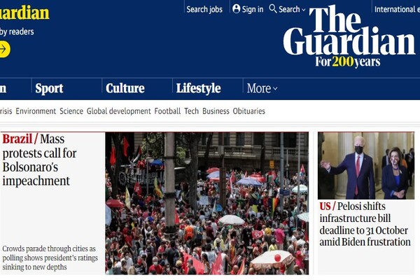 As manifestações contra o presidente Jair Bolsonaro (sem partido) repercutiram na imprensa internacional neste sábado (2). Por exemplo, o britânico The Guardian publicou: “Protestos em massa pedem impeachment de Bolsonaro”.