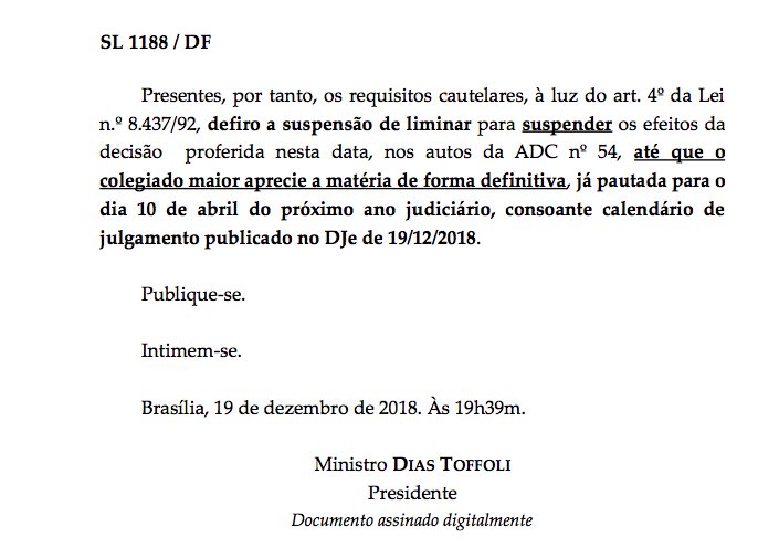 Ele deferiu recurso da procuradora-geral da República, Raquel Dodge, e suspendeu os efeitos da liminar até que o plenário julgue o mérito das ações declaratórias de constitucionalidade, o que está agendado para abril.