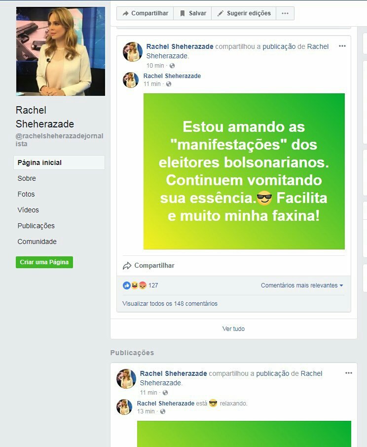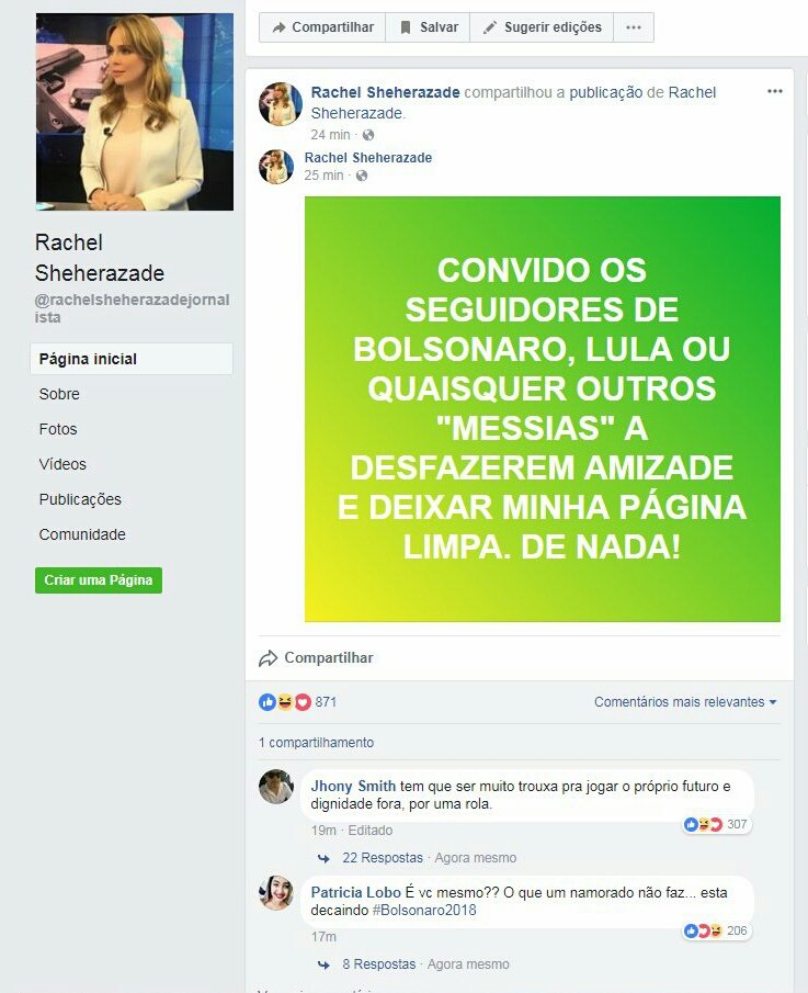 “Jair Bolsonaro foi o único político a defender Rachel Sheherazade quando a esquerda queria sua cabeça”, disse um sujeito. “Depois disso, ela se envolveu com um militante tucano e passou a atacar Jair”.