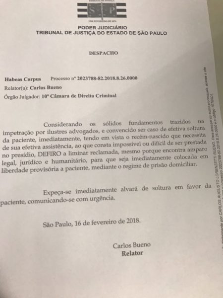 O Tribunal de Justiça de São Paulo acaba de conceder liminar para tirar da cadeia Jéssica Monteiro, de 24 anos, que teve um bebê um dia depois de ser presa, em São Paulo, acusada de portar 90 gramas de maconha. O advogado de Jéssica havia pedido prisão domiciliar, para que ela pudesse cuidar do filho em condições mínimas de higiene, saúde e segurança, mas a promotora, que está grávida, se manifestou contrária ao pedido, e o juiz manteve no cárcere, juntamente com a criança. Jéssica ficou em uma cela minúscula, com um colchão no chão. A OAB de São Paulo entrou com habeas corpus no início da tarde de hoje, em ação assinada por duas advogadas, Luiza Nagib Eluf, líder de movimento de mulheres e da Comissão da Mulher Advogada, e Cármen Dora de Freitas Ferreira, presidente da Comissão da Igualdade Racial, ambas da OAB, além do presidente da instituição, Marcos da Costa, e o presidente da Comissão de Direitos Infantojuvenis.