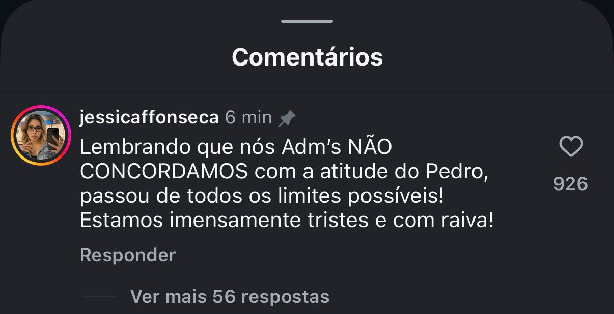 “Lembrando que nós Adm’s não concordamos com a atitude do Pedro, passou de todos os limites possíveis! Estamos imensamente tristes e com raiva!”, escreveu.