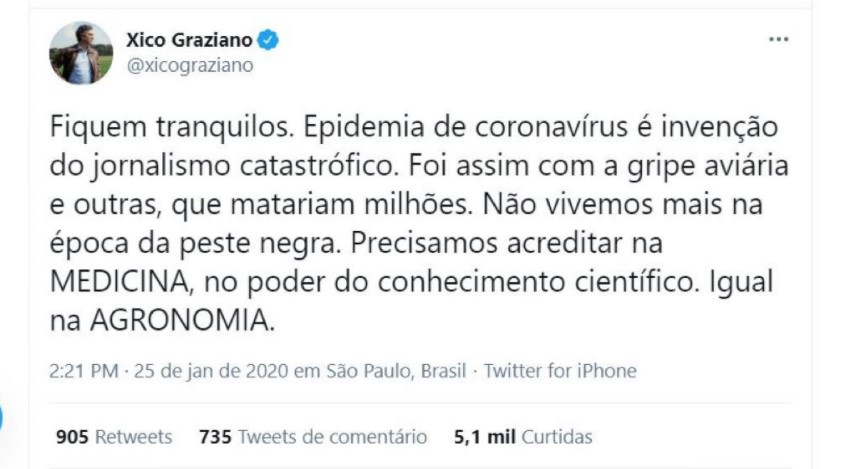 “Fiquem tranquilos. Epidemia de coronavírus é invenção do jornalismo catastrófico. Foi assim com a gripe aviária e outras, que matariam milhões. Não vivemos mais na época da peste negra. Precisamos acreditar na MEDICINA, no poder do conhecimento científico. Igual na AGRONOMIA”, disse Graziano no Twitter.
