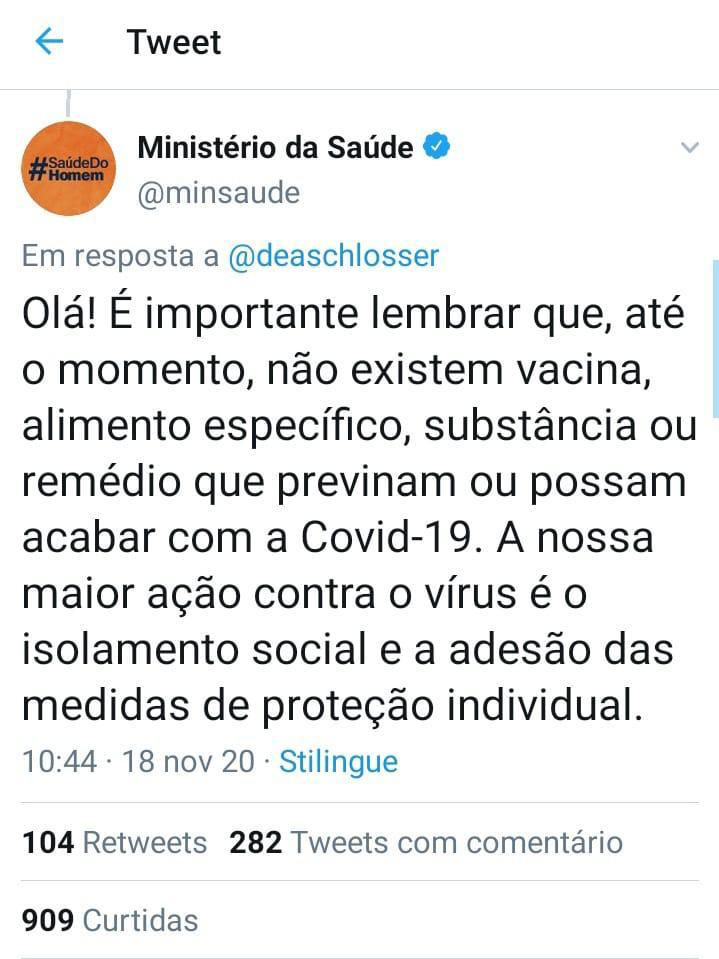 “O Ministério da Saúde esclarece que a resposta ao tweet publicado na manhã desta quarta-feira (18) foi apagada – e posteriormente corrigida – por trazer informações equivocadas. Um erro humano que já foi corrigido.
