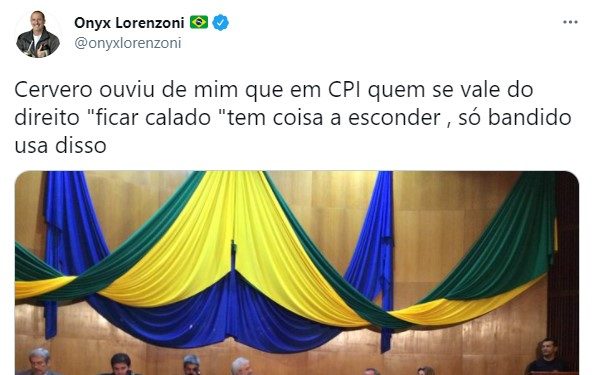 Tuíte resgatado de Onyx diz que ‘ficar calado’ em CPI é algo que ‘só bandido usa’