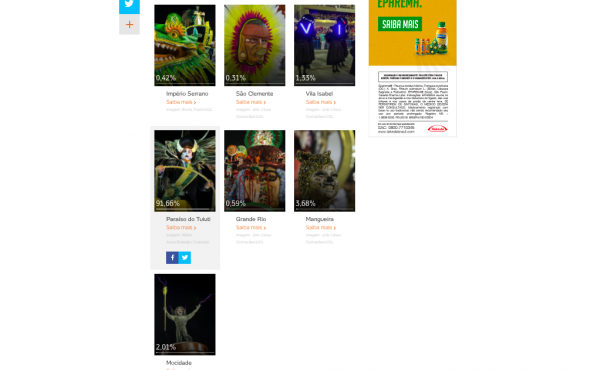 A Paraíso do Tuiuti está vencendo com larga margem de voto a enquete realizada pelo site UOL sobre a melhor escola no primeiro dia do desfile do Carnaval do Rio de Janeiro.Até as 19h15 desta segunda-feira, 12 de fevereiro, tinha quase 92% dos votos. Em segundo lugar, aparecia a Mangueira, com 3.6%. A Paraíso do Tuiuti caiu nas graças da população. É a campeã da galera e, tecnicamente, está entre as melhores também.