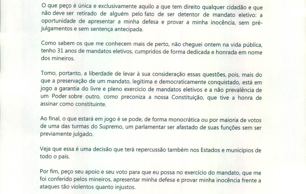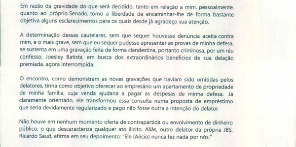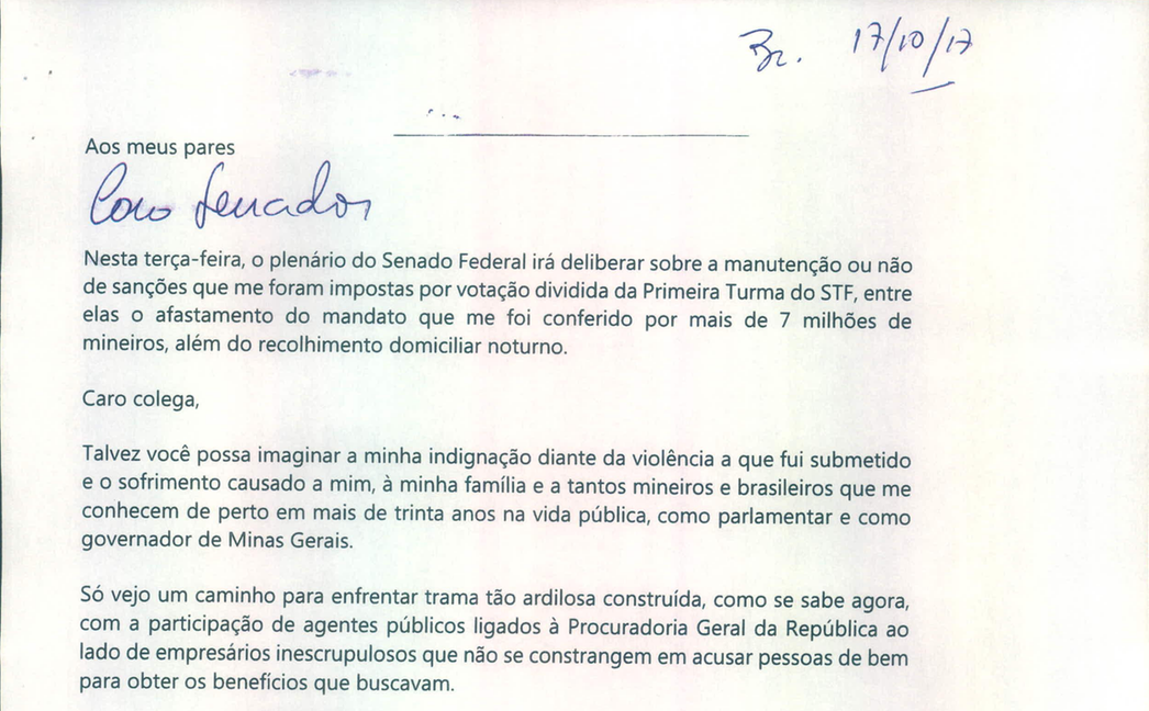 Aécio Neves enviou uma carta aos seus pares, os senadores, rogando por apoio: