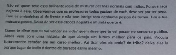 “Não sei quem teve a brilhante ideia de misturar pessoas normais com índios. Porque raça nojenta é essa. Observamos que os professores todos gostam de você, deve ser por ter pena. (…) Tira a tua máscara garota. Deixa de ser essa caboca [sic] nojenta e imunda que tu é”, diz um trecho da carta.