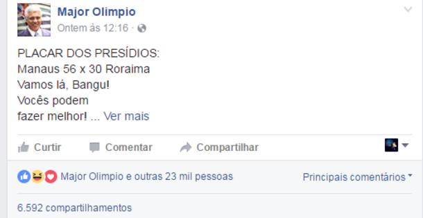“Placar dos presídios: Manaus 56 X 30 Roraima . Vamos lá Bangu, vocês podem fazer melhor”, escreveu o parlamentar no Facebook. Ligado a Polícia Militar, Olímpio disse ao Estado a intenção do post foi “fazer uma ironia”.