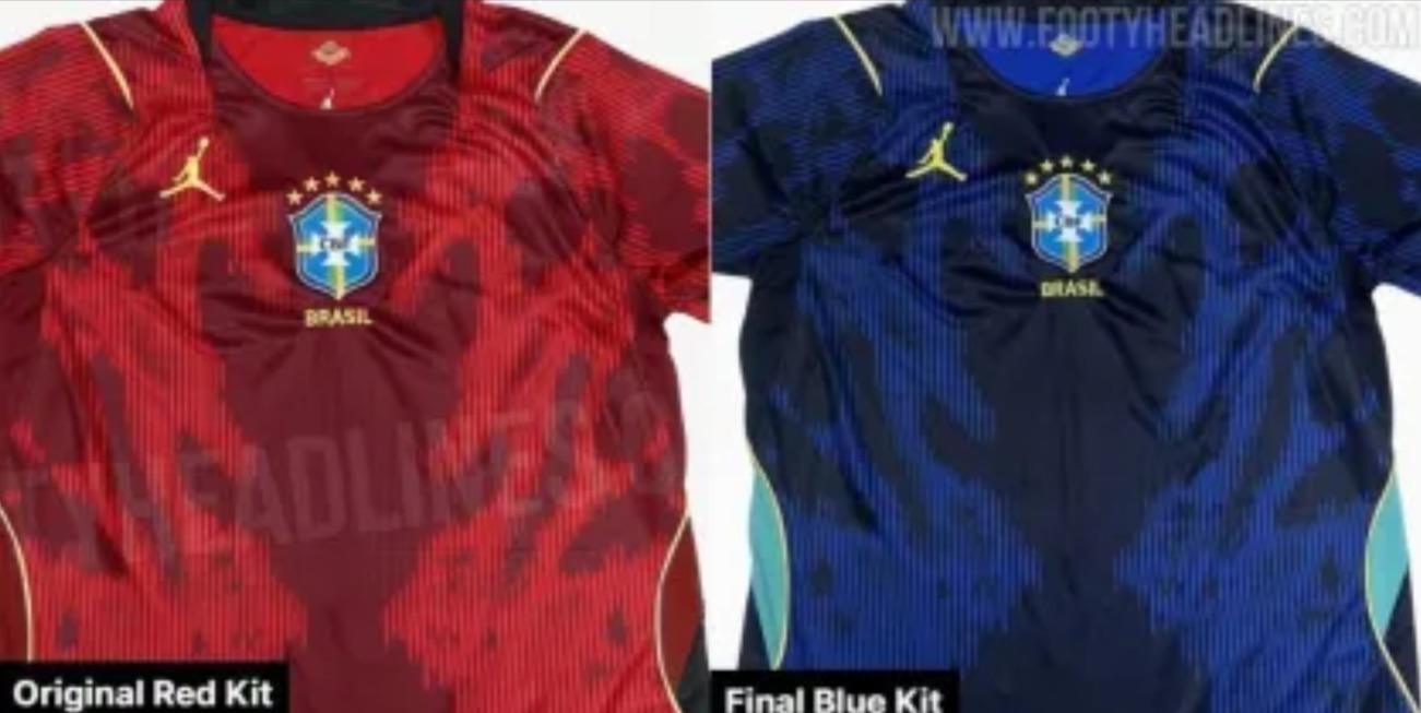 Imagens divulgadas pelo site Footy Headlines revelaram o design original da nova camisa reserva da Seleção Brasileira para a Copa de 2026. O uniforme, desenvolvido pela Jordan, seria lançado em vermelho, inspirado no conceito de “brasas incandescentes”. O grafismo irregular e dinâmico, com formas pontiagudas na parte frontal, gerou forte rejeição entre torcedores e acabou descartado pela CBF.