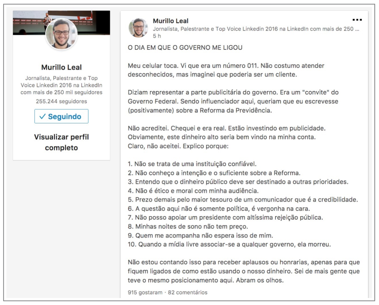 Outro procurado foi Murillo Leal, jornalista e palestrante. “Diziam representar a parte publicitária do governo. Era um “convite” do Governo Federal. Sendo influenciador aqui, queriam que eu escrevesse (positivamente) sobre a reforma da Previdência”, escreveu Murillo na rede social.