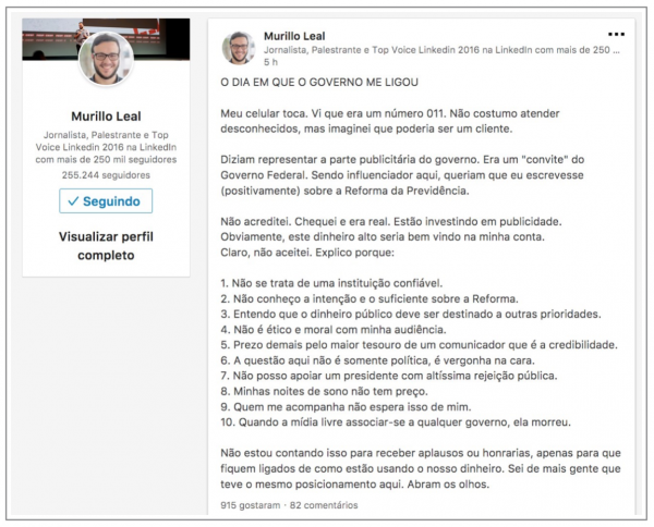 Pelo menos 3 usuários do LinkedIn que possuem 1 número alto de seguidores disseram ter sido procurados pelo governo nos últimos dias para defender a reforma da Previdência. Flavia Gamonar (673 mil seguidores), Murillo Leal (255 mil seguidores) e Matheus de Souza (86 mil seguidores) relatam ter declinado a proposta.
