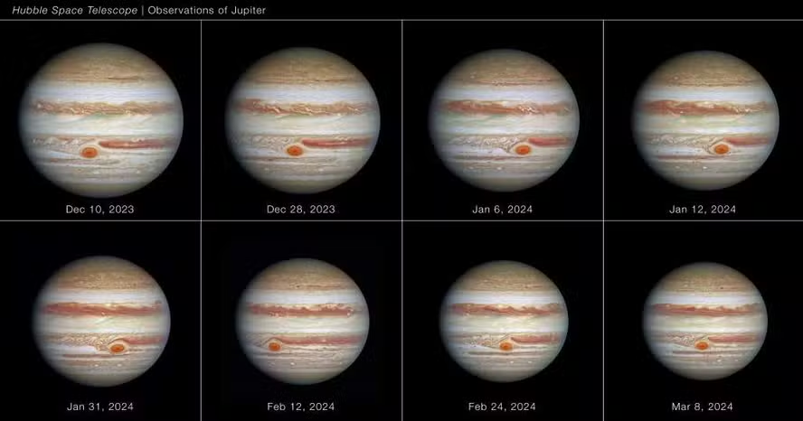 Pesquisadores da Nasa descobriram que a Grande Mancha Vermelha (GRS, na sigla em inglês) de Júpiter, o famoso anticiclone do planeta, se comporta de maneira menos estável do que se acreditava. Usando o Telescópio Hubble, os cientistas acompanharam o fenômeno de dezembro de 2023 a março de 2024 e notaram que a GRS se movimenta de forma irregular, como uma “gelatina”.