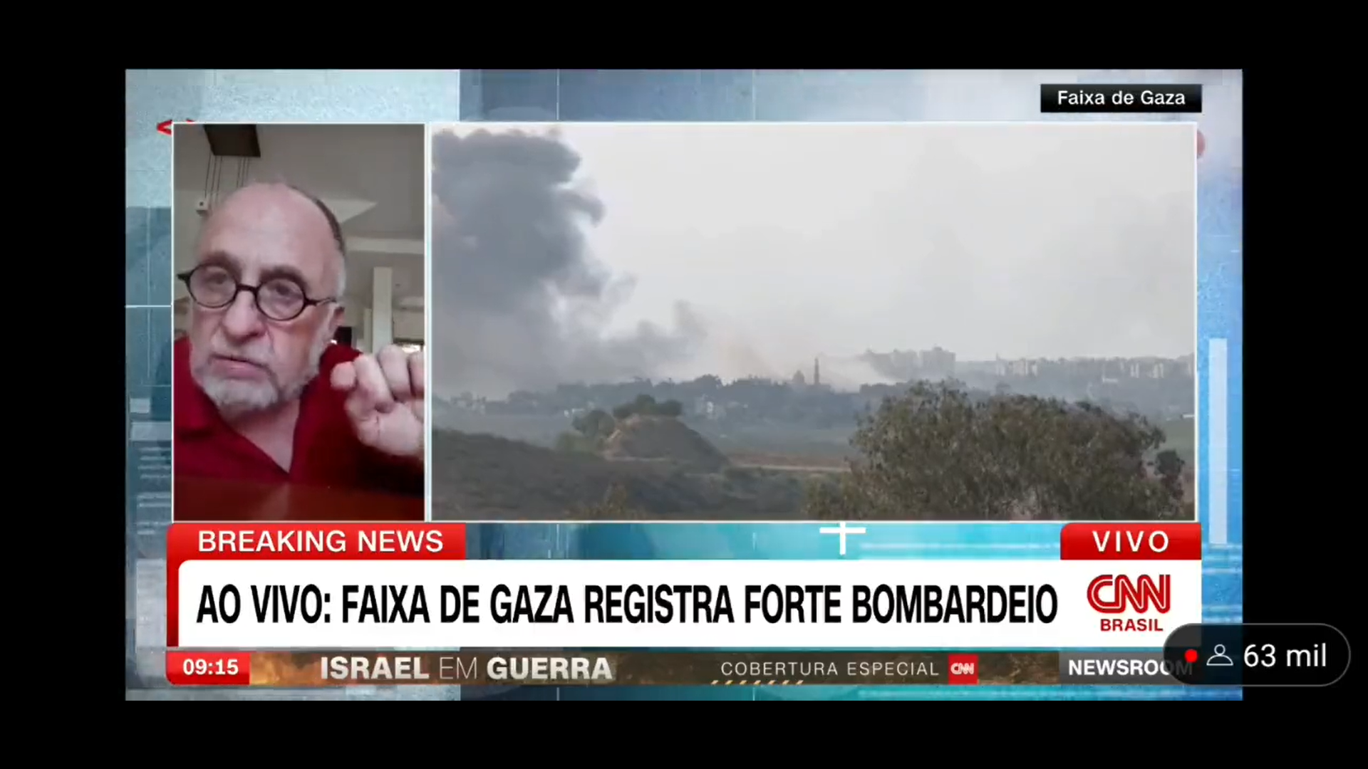 “A gente traz esse relato importante também do olhar dele, que vive ali perto, mora em um Kibutz, próximo à região da faixa de Gaza, onde a gente tem mostrado esses bombardeios. São imagens ao vivo, olha só. Por isso a gente interrompe aqui para mostrar para vocês que esses bombardeios”, alegou a apresentadora do jornal.