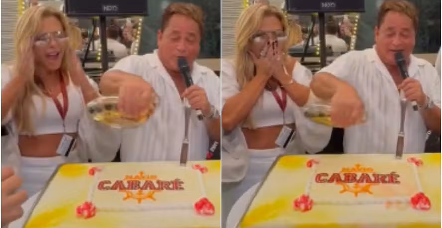 Durante a abertura do Navio Cabaré, o cantor Leonardo, de 62 anos, surpreendeu ao pegar uma garrafa de cachaça e despejar a bebida sobre o bolo que marcava mais uma edição do cruzeiro, gesto que deixou a esposa, a jornalista Poliana Rocha, de 49 anos, sem reação.