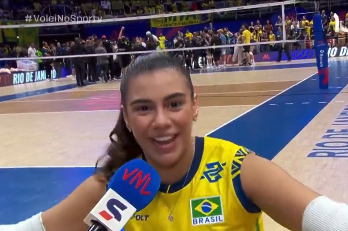 A líbero Kika, da Seleção Brasileira Feminina de Vôlei, viralizou nas redes após entrevista depois da derrota do time para a Itália na Liga das Nações. Ela estreou neste domingo (8) e seu carisma chamou atenção de internautas, que levaram seu nome aos temas mais comentados do X, com mais de 10 mil menções.