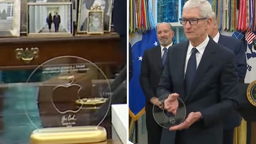 Tim Cook, CEO da Apple, presenteou Donald Trump com uma peça exclusiva de vidro Corning montada sobre uma base de ouro 24 quilates, com o logotipo da empresa. A entrega aconteceu durante um evento na Casa Branca, na quarta-feira (6), quando Cook anunciou um investimento de US$ 100 bilhões para expandir a produção da Apple nos Estados Unidos. A peça contém o nome de Trump, a assinatura de Cook, a frase “Made in USA” e o ano de 2025.