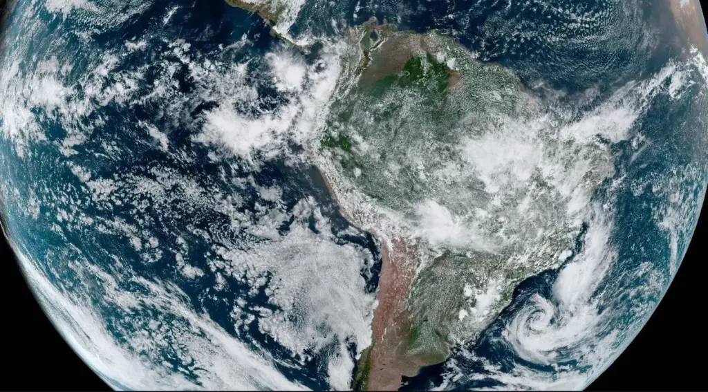 🌍 Imagens do satélite GOES-19, da Nasa, mostram a dimensão do ciclone extratropical que avançou sobre a Região Sul entre terça e quarta-feira (9 e 10/12). As capturas evidenciam a estrutura ampla e bem definida do sistema.