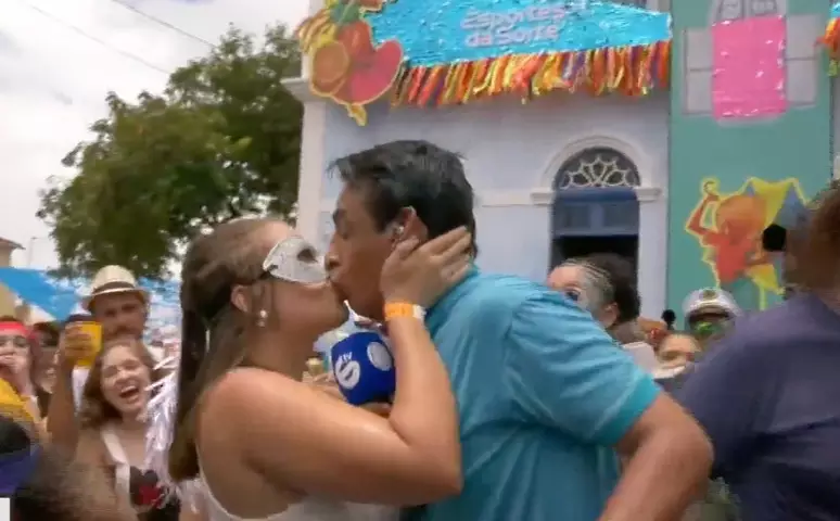 O repórter Rafael Cabral, da TV Guararapes (afiliada da Record em Pernambuco), foi surpreendido durante uma transmissão ao vivo no Carnaval de Olinda. Ao entrevistar uma foliona e perguntar “E tu, minha amiga, é de onde?”, a mulher respondeu com um beijo na boca diante das câmeras. O momento foi comemorado por foliões ao redor e viralizou nas redes sociais.