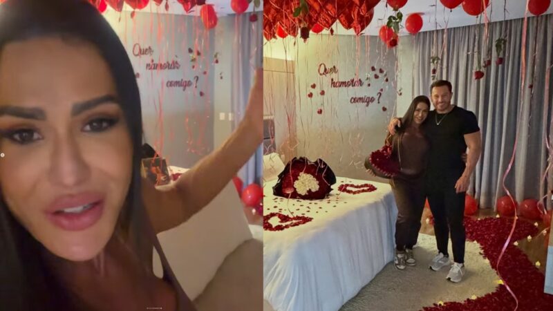 A influenciadora e ex-BBB Gracyanne Barbosa, de 42 anos, foi pedida em namoro pelo empresário Gabriel Cardoso, de 35, e oficializou o relacionamento. O pedido ocorreu em um ambiente preparado com flores, pétalas espalhadas pelo chão, velas e balões, conforme imagens divulgadas pela própria influenciadora nas redes sociais.