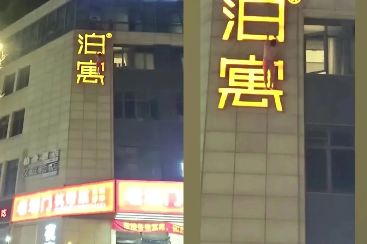Um vídeo que viralizou na China mostra um homem pendurado em um grande letreiro luminoso de um hotel, a vários andares de altura, vestindo apenas uma cueca. A cena chocante ocorreu na cidade de Hangzhou, na província de Zhejiang. Segundo relatos locais, o homem teria sido flagrado traindo a esposa e tentado fugir pela janela, escalando a parede externa até o letreiro.
