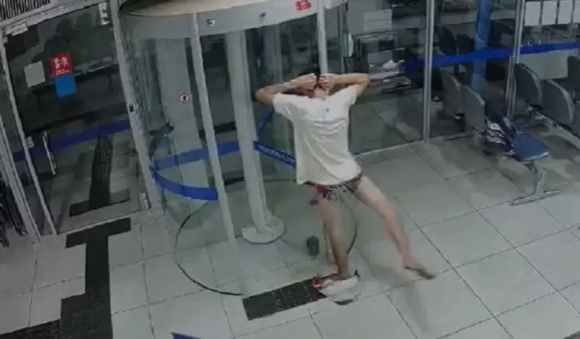 Um homem de 20 anos tentou furtar uma agência da Caixa em Carangola, no interior de Minas Gerais, e acabou preso na porta giratória durante a ação, permanecendo apenas de cueca. O caso ocorreu na madrugada de sexta (21) e foi registrado por câmeras internas do banco.
