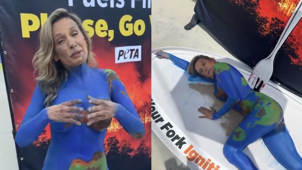 A ação foi organizada em parceria com a ONG internacional Peta, conhecida por suas campanhas em defesa dos direitos dos animais. No ato, Luisa Mell se posicionou dentro de um prato cenográfico, com um garfo espetado sobre o corpo e um cartaz exibindo uma floresta em chamas.