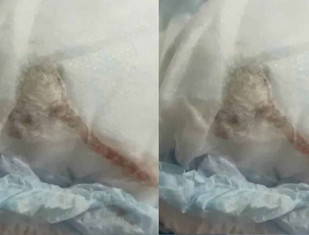 O pacote estava lacrado e havia sangue do animal na aba lateral da fralda, o que indica que o problema veio da fábrica. Desesperada, Mariana limpou o bebê com álcool 70 e ligou para o SAC da empresa.