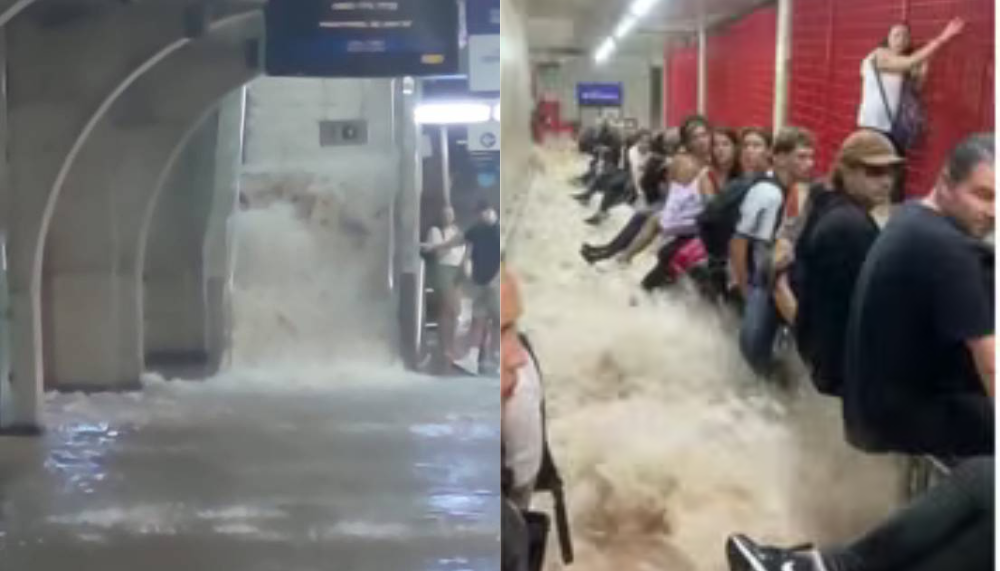 Passageiros tiveram que se agarrar em grades para não serem arrastados pela correnteza. Vídeos divulgados nas redes sociais mostram uma “cachoeira” nas escadas rolantes que dão acesso à plataforma.
