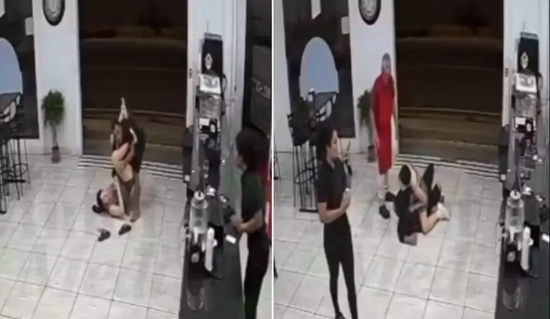 As imagens, captadas por uma câmera de segurança, mostram a jovem sentada de costas para o balcão, com o celular ao lado. O suspeito se aproxima, pega o aparelho e tenta fugir, mas é surpreendido pela reação da vítima. Ela parte para cima dele e, após uma breve luta, aplica uma chave de braço, imobilizando o assaltante no chão.
