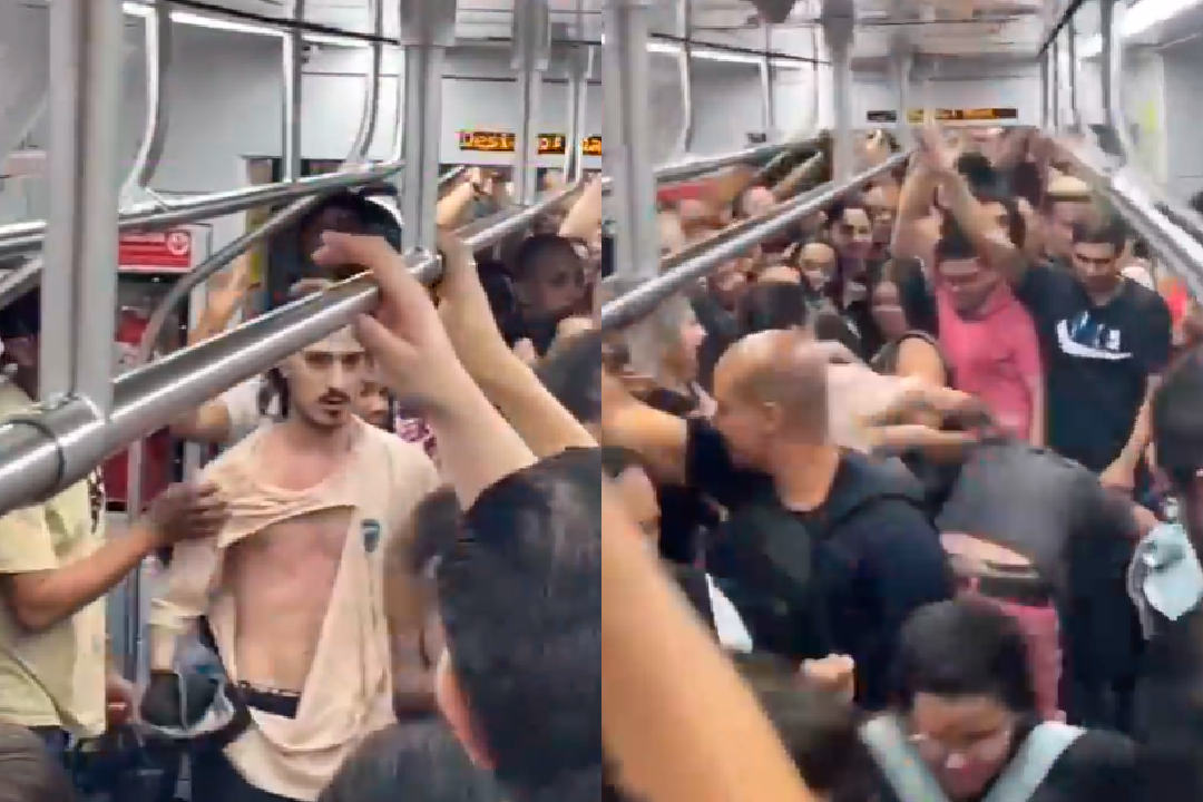 O conflito, em um vagão da Linha 10-Turquesa, provocou gritos e reações variadas dos presentes, que tentaram separar os dois. A briga só terminou quando o primeiro homem foi afastado do outro, mas não antes de ter sua camisa rasgada no tumulto. Veja: