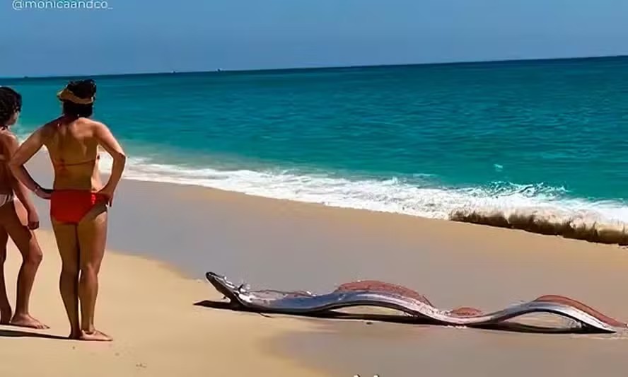 Um peixe-remo, espécie conhecida popularmente como “peixe do fim do mundo”, apareceu em águas rasas na praia de Cabo San Lucas, no México. O animal, que normalmente vive em grandes profundidades do oceano, foi visto por banhistas, que tentaram devolvê-lo ao mar. O momento foi registrado em vídeo e circulou nas redes sociais.