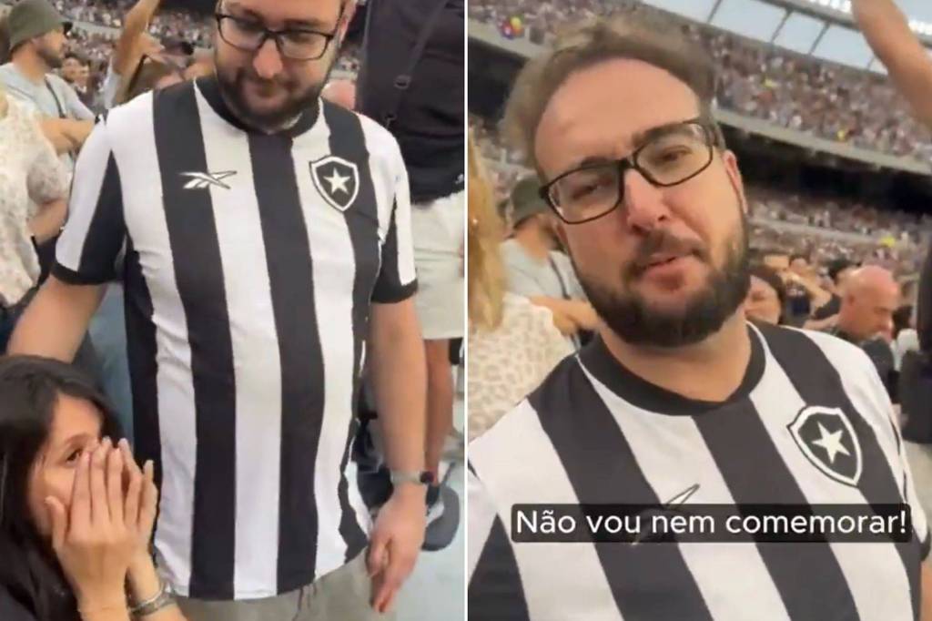 Em um vídeo que circula nas redes sociais, um torcedor do Botafogo, em vez de comemorar o título inédito da Libertadores, aparece abraçando a esposa, torcedora do Atlético Mineiro, que chora intensamente. O Fogão venceu o Galo por 3 a 1.