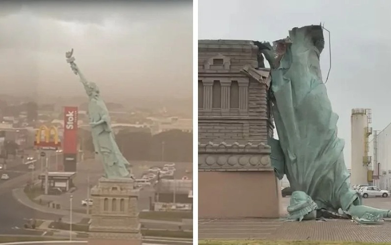 A Estátua da Liberdade localizada em frente à loja Havan de Guaíba, na Região Metropolitana de Porto Alegre (RS), desabou durante o forte temporal que atingiu a cidade na tarde desta segunda (15). A escultura, que tem 35 metros de altura, sofreu danos devido a rajadas de vento superiores a 90 km/h, conforme alertado pela Defesa Civil.