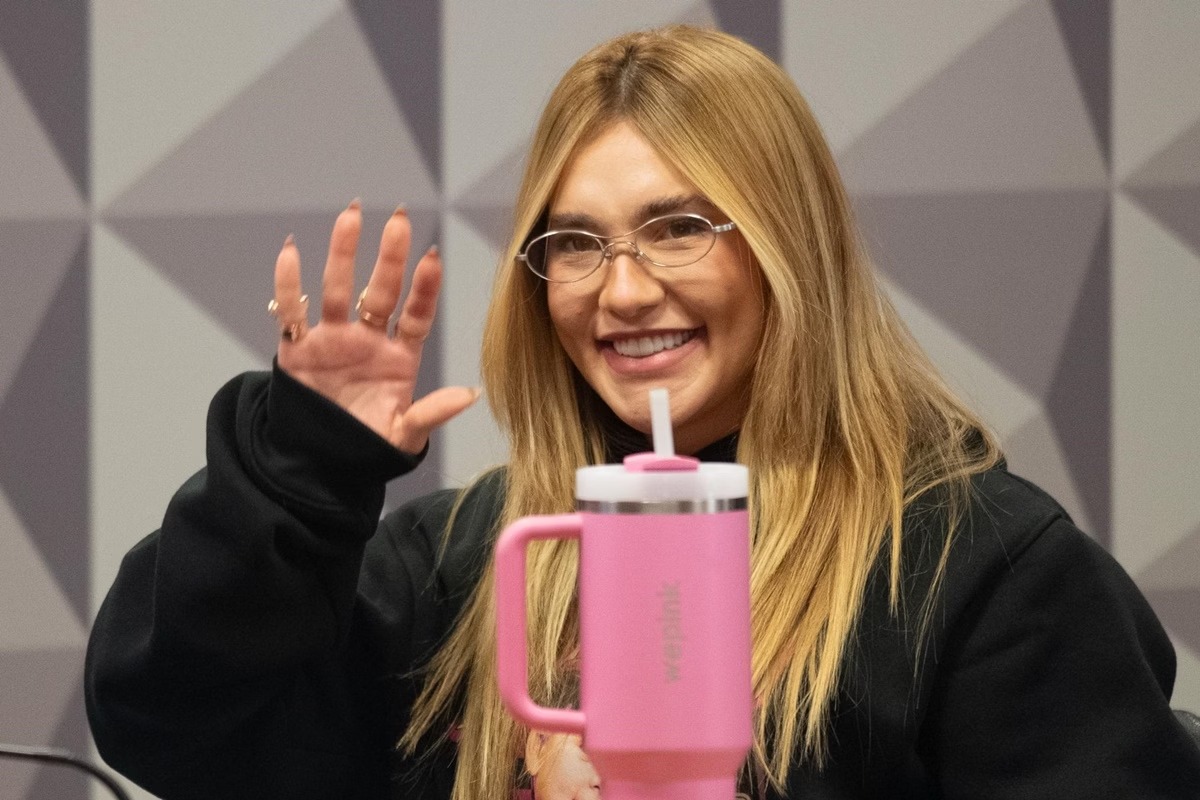 A influenciadora Virginia Fonseca chegou ao Senado para depor à CPI das Apostas Esportivas, nesta terça-feira (13), vestindo um moletom com o rosto de uma das filhas e segurando um copo térmico rosa estampado com sua marca. Além do rosto de Maria Flor, de 2 anos, a blusa é estampada com a frase “FloFlo Biuta”, bordão da criança que viralizou.