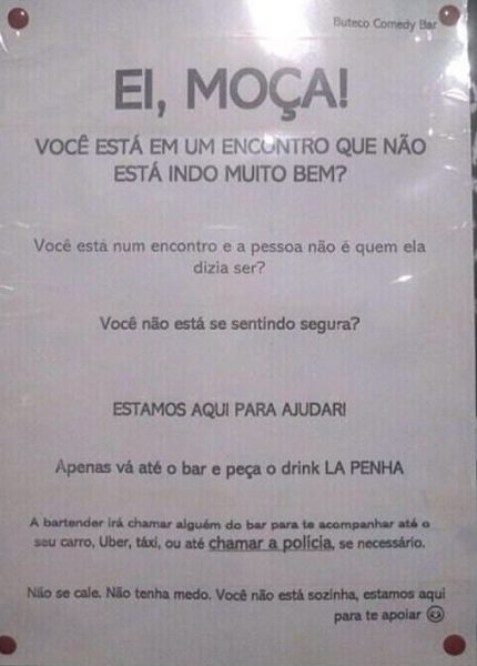 Mariana Caruso informa, em seu blog no jornal O Globo, que o Buteco Comedy Bar, em Canoas, Rio Grande do Sul, pregou um aviso em seu banheiro feminino para ajudar as mulheres que estiverem sendo importunadas na noitada.
