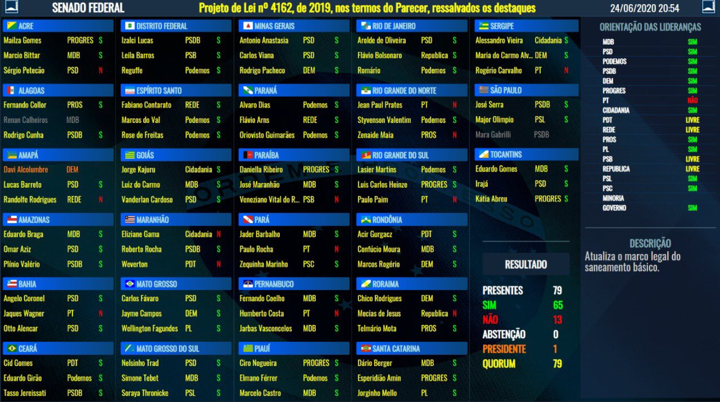 Resultado da votação da privatização da água no Senado. 65 votos a favor e só 13 votos contra. Absurdo! Algumas surpresas que vão decepcionar muita gente nos votos aí embaixo. pic.twitter.com/P3b82Druv1
