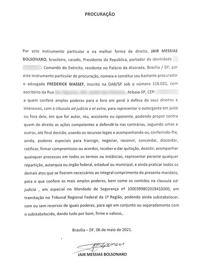 A procuração determina que Wassef poderá, em nome do presidente, “transigir, negociar, reconvir, concordar, discordar, ratificar, firmar compromissos ou acordos, receber e dar quitação, desistir, acompanhar quaisquer processos em todos os termos ou instâncias, representar (o presidente) perante qualquer repartição, autarquia ou órgão federal, estadual ou municipal”.