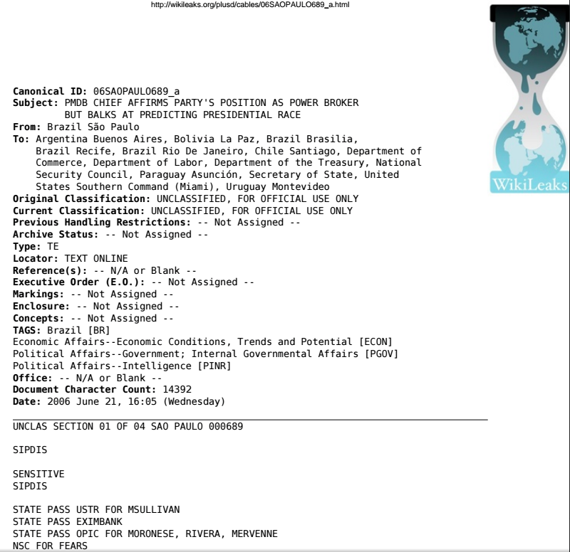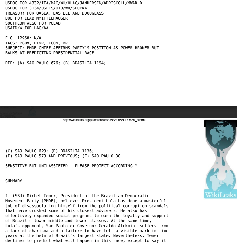 Segundo os documentos divulgados pela organização sueca, Michel Temer teria falado com a embaixada via telegrama e o conteúdo seria classificado como “sensível” e “para apenas uso oficial”. As transmissões dos arquivos teriam sido feitas no dia 11 de janeiro 2006 (quarta-feira), às 14h02 e no dia21 de junho 2006 (quarta-feira), às 16h05. Não há informações sobre o fuso horário da entrega.