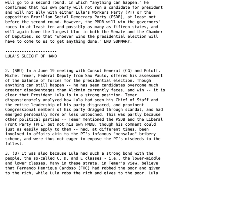 Temer teria analisado cenários em que o partido dele (PMDB) poderia ganhar as eleições. Nos documentos, ele também teria falado sobre as diferenças entre Lula e Fernando Henrique Cardoso. Em uma das frases citadas no texto, Temer teria dito que “as classes C, D e E acreditam que Fernando Henrique roubou dos pobres e deu para os ricos. Já Lula roubou dos ricos para dar aos pobres”.