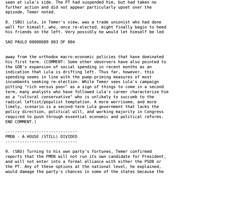 Nos documentos divulgados, Temer passaria sua visão de como estava a situação política no Brasil na época. São opiniões sobre as eleições que ocorreriam em 2006, quando Lula foi reeleito.