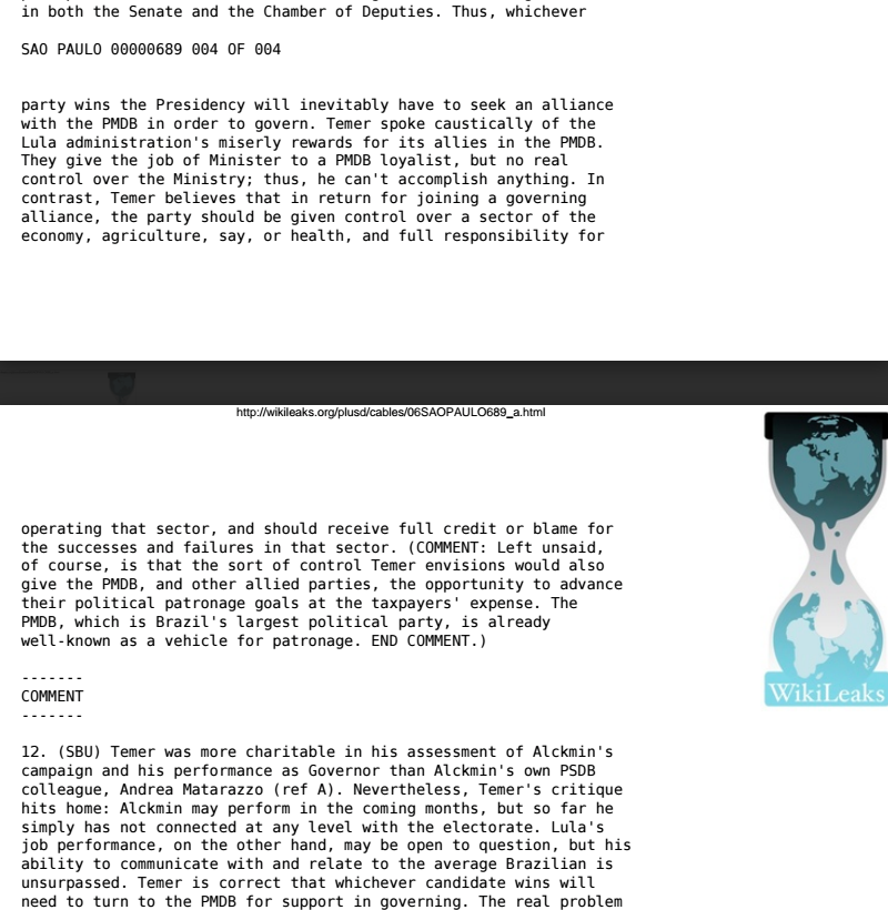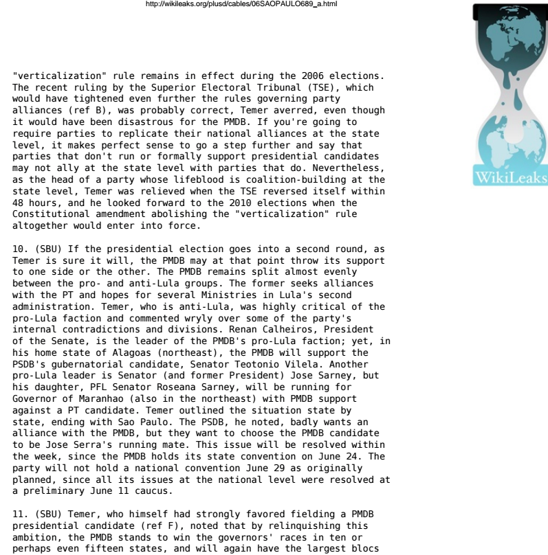 Em documentos divulgados na noite desta quinta-feira (12/5) no Twitter, o perfil oficial do Wikileaks afirma que o presidente interino do Brasil, Michel Temer (PMDB), foi informante da Embaixada dos Estados Unidos no Brasil.