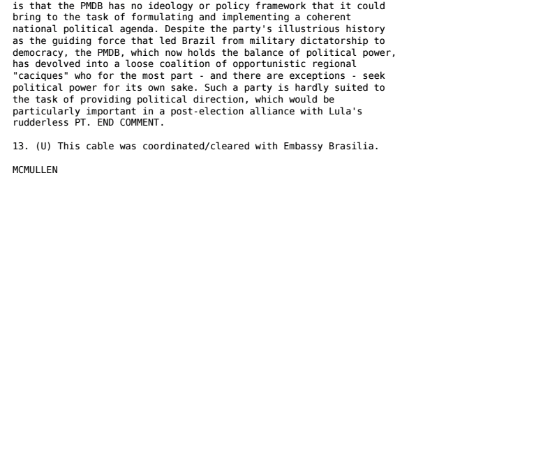 Os telegramas falam ainda sobre uma possível disputa entre um candidato do PMDB com Lula, caso não houvesse acordo entre os partidos. O nome de Anthony Garotinho teria sido cogitado neste momento, mas haveria uma resistência no PMDB. Germano Rigotto, na época governador do Rio Grande do Sul, e Nelson Jobim, ex-ministro da Defesa, também foram cogitados.