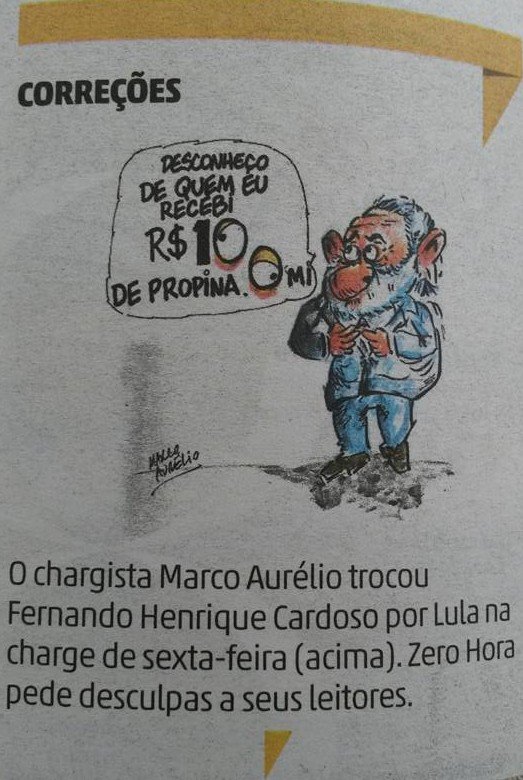 O chargista Marco Aurélio, do jornal Zero Hora, cometeu um erro na edição da última sexta-feira (15), ao desenhar em sua charge o ex-presidente Lula ao invés do também ex-presidente Fernando Henrique Cardoso. Na imagem, Lula aparece falando: ”Desconheço de quem eu recebi R$100 mi de propina”.
