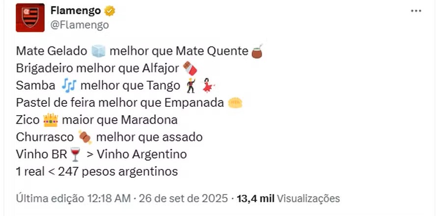 Em uma das postagens, os rubro-negros afirmaram que “Zico foi melhor que Maradona” e compararam símbolos culturais dos dois países, destacando “brigadeiro melhor que alfajor”, “samba melhor que tango” e “pastel de feira melhor que empanada”.