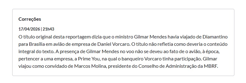 Por fim, o jornal reiterou que o título da reportagem publicada anteriormente não refletia o conteúdo integral apresentado no texto. A correção foi publicada após a repercussão do caso envolvendo a citação do nome do ministro.