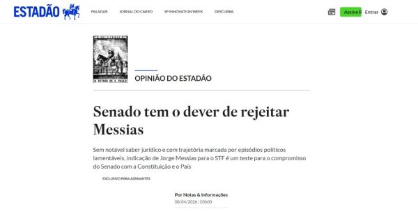 O Estadão também diz que Messias poderá ficar no Supremo até 2055, quando terá 75 anos, e que “a má escolha de Lula, se corroborada pelos senadores, poderá influenciar a jurisprudência constitucional do País por longas décadas. Uma temeridade“.