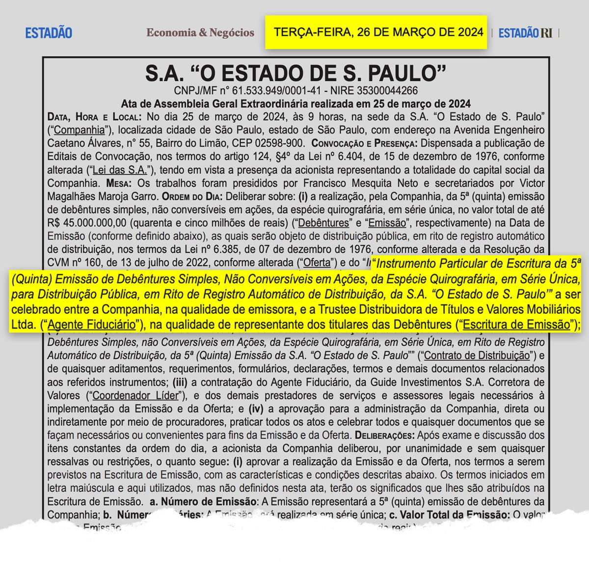 No ano seguinte, a operação foi estruturada em duas emissões de debêntures: uma primeira, de R$ 45 milhões, em março de 2024, e outra de R$ 97,5 milhões, em maio do mesmo ano. A contratação da Trustee foi aprovada em assembleia presidida por Francisco Mesquita Neto.