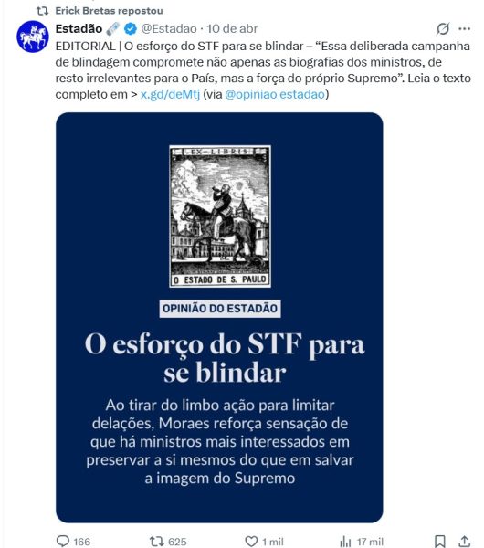 Bretas tem passagem pelo Grupo Globo, onde foi diretor do Globoplay. Ele dirigia a área de produtos digitais e canais pagos quando saiu da empresa após 26 anos. Nas redes sociais, o CEO do Estadão ataca diariamente o Supremo Tribunal Federal, com foco especial na relação de ministros da Corte, como Alexandre de Moraes e Dias Toffoli, com o Banco Master.