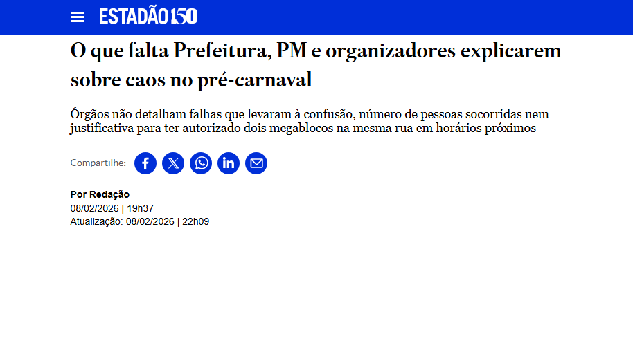 O que aconteceu em São Paulo, com gente sendo pisoteada, foi a prova de que a extrema direita não consegue gerir nem mesmo o carnaval de rua. Mas ninguém, além do Estadão, quer ouvir explicações.