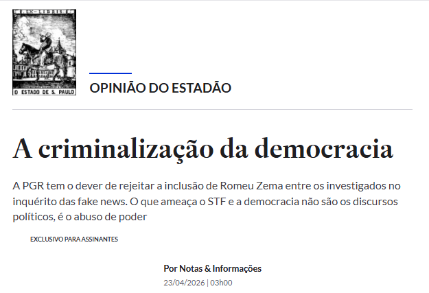Por fim, o Estadão cobrou o PGR Paulo Gonet que, “ao examinar o caso, a PGR deve rejeitar a inclusão de Zema no inquérito das fake news, pois não há crime a apurar, e sim um discurso político a ser resguardado”.